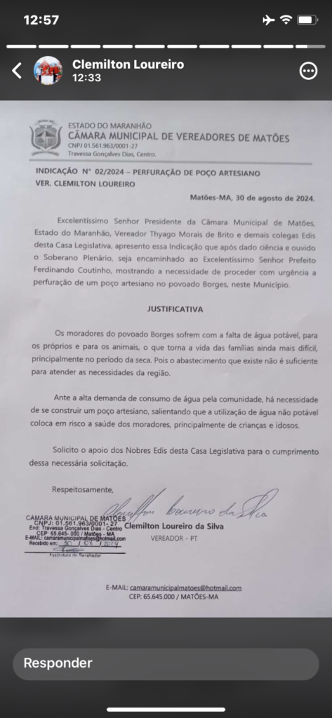 Um indicação apresentada na Câmara Municipal de Matões na última sexta-feira (30), do vereador Clemilton Loureiro (PT), apela a perfuração de um poço artesiano para atender os moradores do Povoado Borges, que sofrem com a falta de água potável.