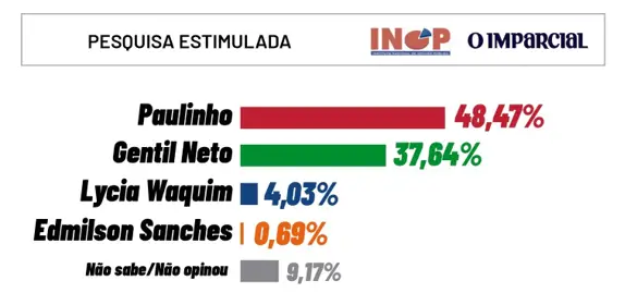 Já no cenário de pergunta ESTIMULADA, quando o entrevistador apresenta uma lista de candidatos ao interrogado, Paulinho lidera com 48,47%, Gentil Neto fica com 37,64%, Lycia Waquim com 4,03% e Edmilson Sanches com 0,69%. Enquanto 9,17% não souberam responder.