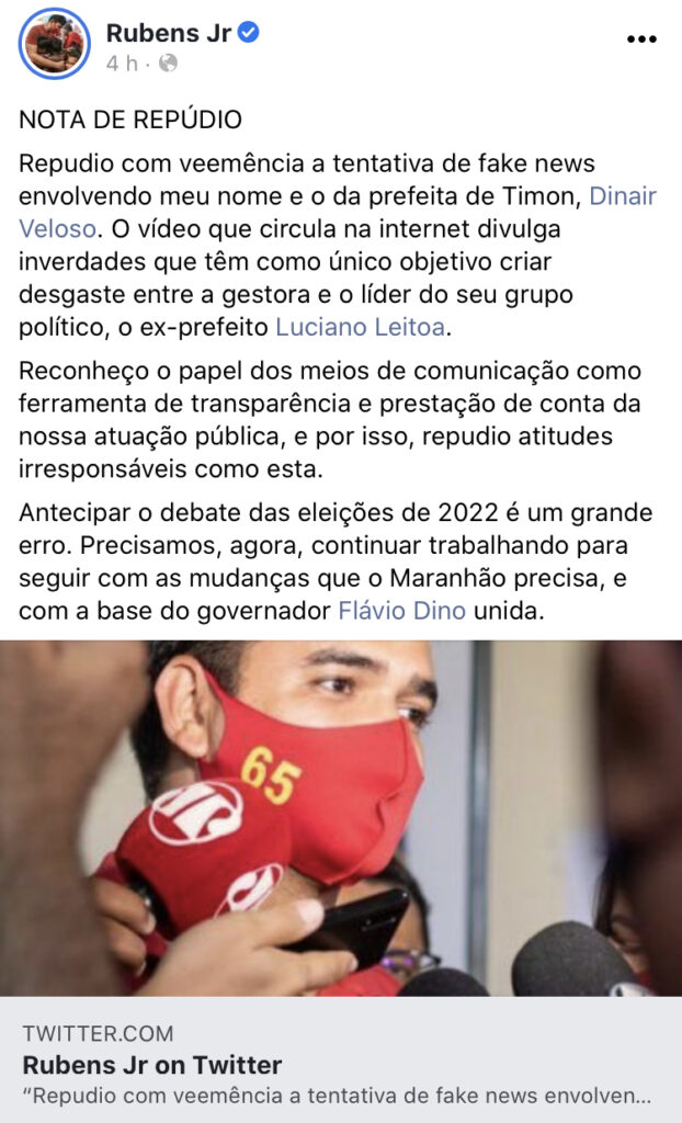 O Deputados Federal do (PCdoB) Rubens Pereira Jr foi anunciado para assumir a Secretaria de articulação Política pelo Governador Flávio Dino na semana passada, logo nos primeiros dias já encara Fake News.