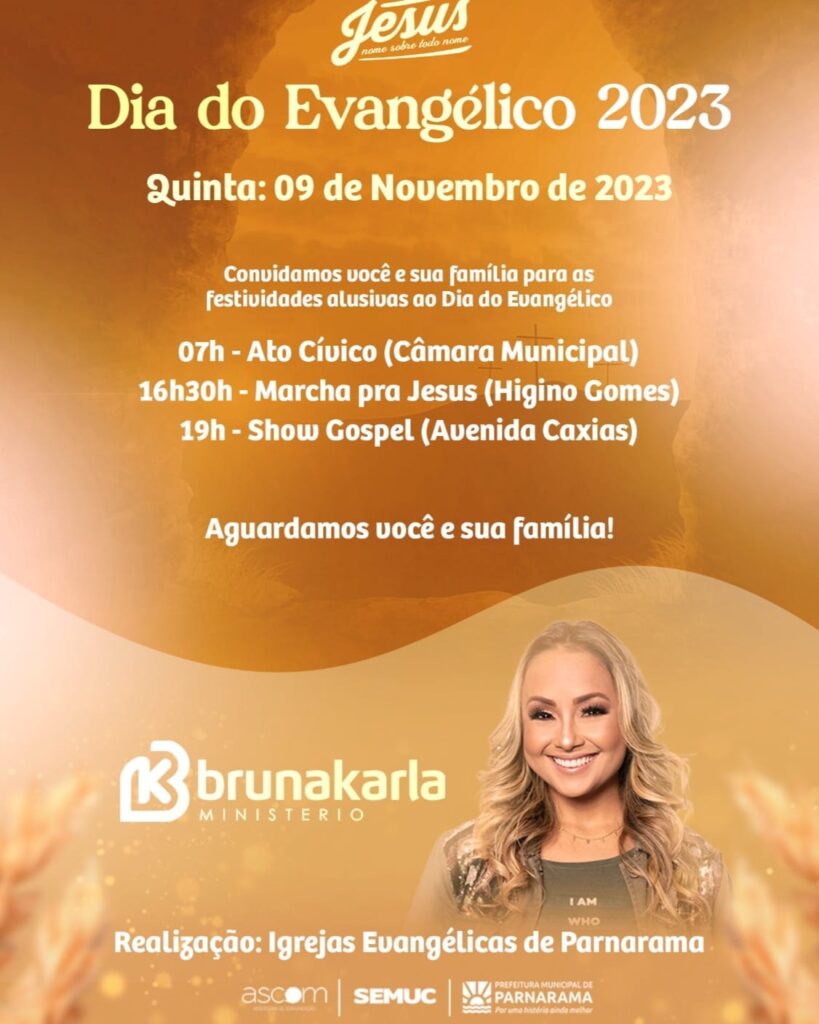 A programação começa com um ato cívico na Câmara Municipal às 7:00 hrs da manhã. Já na parte da tarde, às 16:30 hrs, acontece a Marcha Para Jesus, onde os fieis devem percorrer ruas da cidade. Na parte da noite, a famosa cantora gospel Bruna Karla deverá se apresentar em um palco na Avenida Caxias, centro da cidade, às 19;00 hrs. A programação é gratuita e livre para todos os públicos.