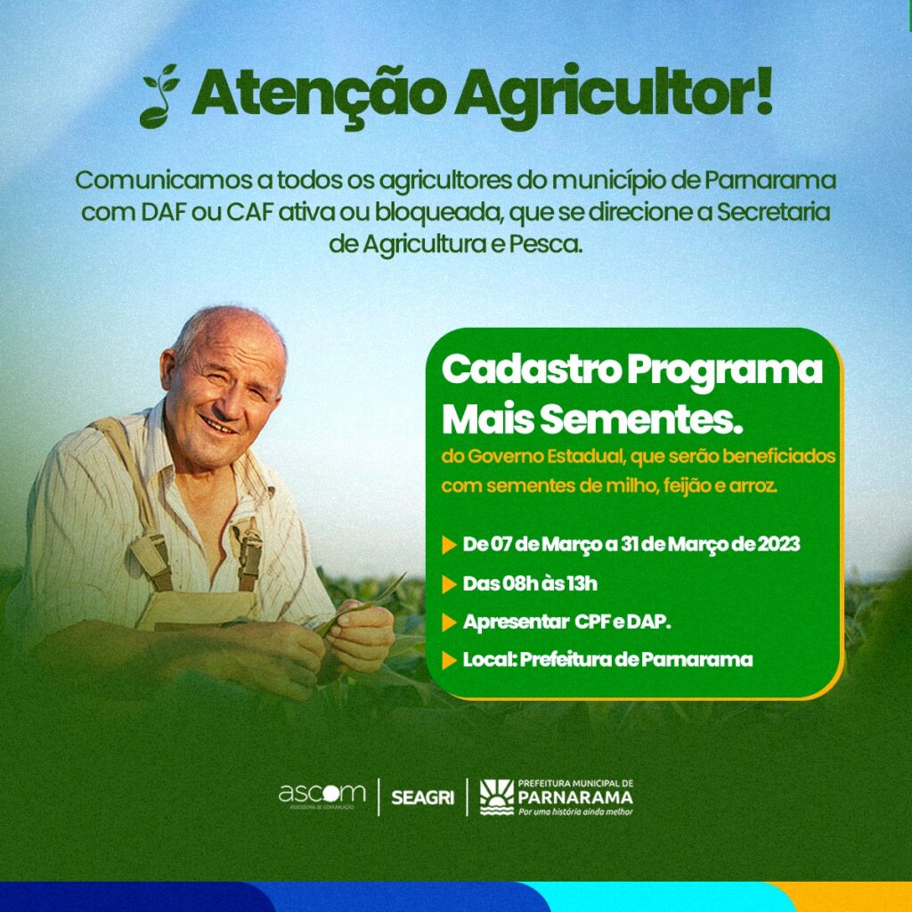 A secretaria de Agricultura e Pesca de Parnarama está convocando agricultores da cidade para o cadastramento do Programa Mais Sementes do Governo do Estado.