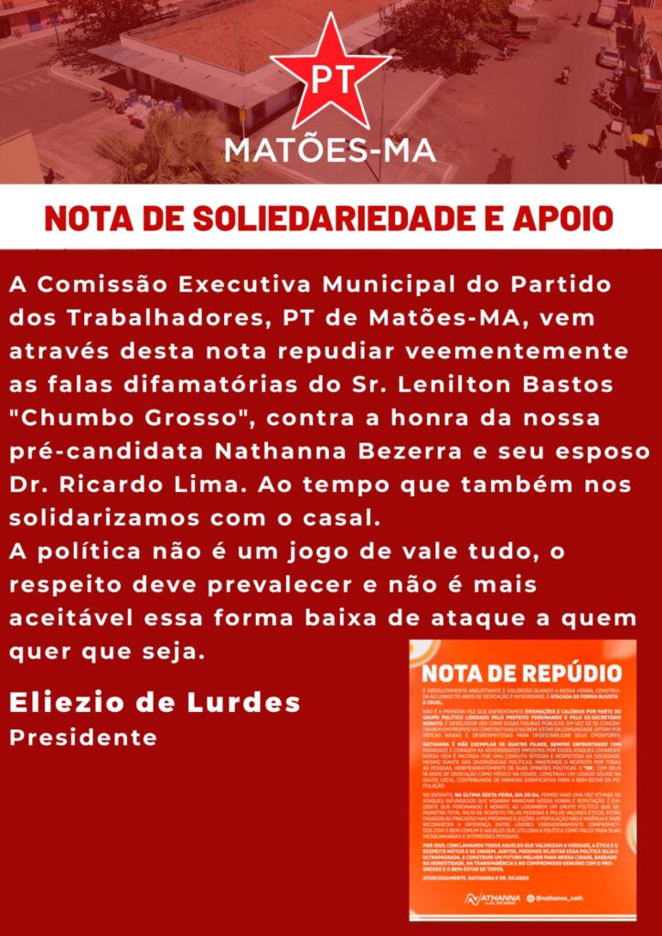 Nesta tarde (07) a dirigente nacional do Partido dos Trabalhadores (PT), Cricielle Muniz, publicou um vídeo nas redes para rebater ataques de adversários que a pré-candidata a vereadora de Matões pelo PT, Nathana Bezerra, vêm sofrendo na cidade. Veja: