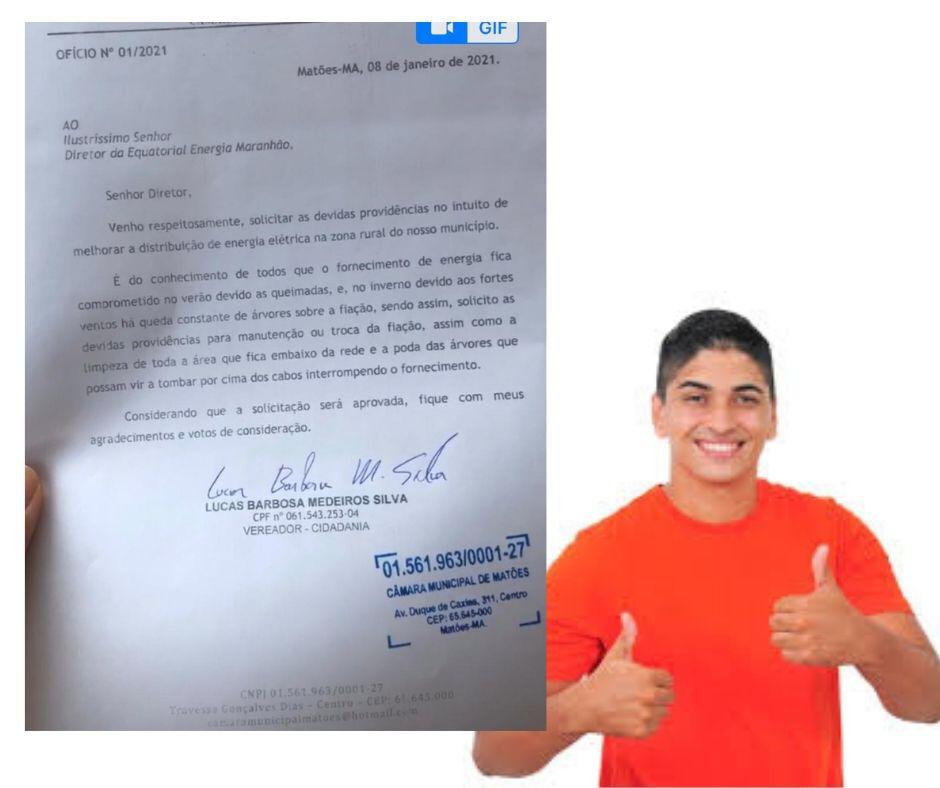 Vereador Lucas Medeiros (Cidadania) solicitou atenção e melhorias da rede de distribuição de energia por parte da empresa da Equatorial Energia do Maranhão, que é responsável pelo abastecimento.