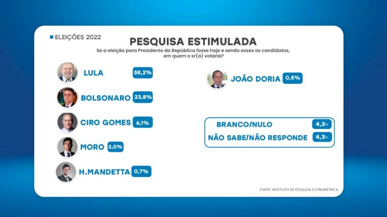 No cenário estimulado, foi perguntado “se a eleição para Presidente da República fosse hoje e sendo esses os candidatos, em quem o sr(a) votaria?”. Em primeiro lugar o ex-presidente Lula atingiu 58,2% das intenções de voto, seguido por Jair Bolsonaro que ficou ainda mais atrás, 23,8 %. Ciro Gomes aparece com 6,1%, Sérgio Moro com 2%, Henrique Mandetta também com 0,7% e João Dória com 0,5%. 4,3% votariam em branco/nulo e 4,3% não sabem ou não respondeu.
