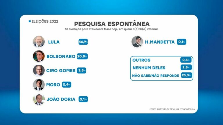 Na primeira pergunta : “se a eleição para Presidente fosse hoje, em quem o(a) Sr(a) votaria?”. Em primeiro lugar, Lula atingiu 46,9% das intenções de voto, seguido por Jair Bolsonaro, com menos da metade, 20,8%. Ciro Gomes aparece com 3,5%, Sérgio Moro com 0,4%, João Dória com 0,1% e Henrique Mandetta também com 0,1%. 0,4% votariam em outros. 2,8% votariam em nenhum deles e 25% não sabem ou não respondeu.