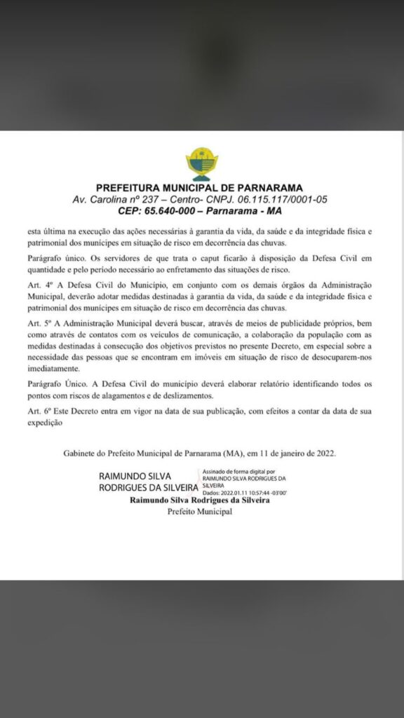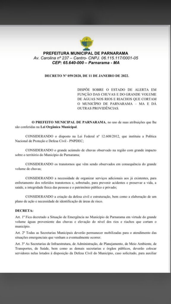 A Prefeitura de Parnarama editou decreto nessa terça-feira (11) visando se antecipar de possíveis impactos que podem ser deixados pelo grande acúmulo de chuvas na região. O decreto visa deixar em alerta os servidores municipais lotados nas secretarias de Infraestrutura, Administração, Planejamento, Meio Ambiente, Transportes e de Saúde, para eventual mobilização de emergência em atendimento a possíveis vítimas de danos causadas pela elevação de rios e riachos em áreas de risco.
