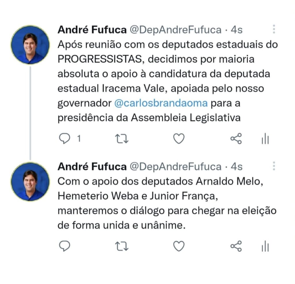 O deputado André Fufuca (PP), garantiu apoio a deputada Iracema Vale na corrida pela presidência da Assembléia Legislativa do Maranhão.