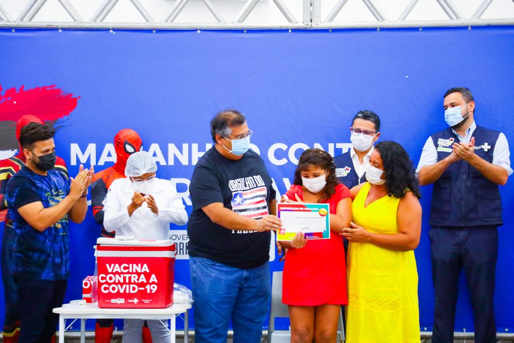 A primeira criança vacinada contra a Covid-19 no Maranhão foi a pequena Maires Vitória, de 11 anos, diagnostica com Transtorno do Espectro Autista (TEA). Na sequência, foram imunizados Isabela Moraes, também de 11 anos, vítima da paralisia infantil, e Arthur Gabriel, de 7 anos, portador da Síndrome de Down. Além da dose do imunizante, cada uma das três crianças recebeu das mãos do governador um Certificado de Vacinação.