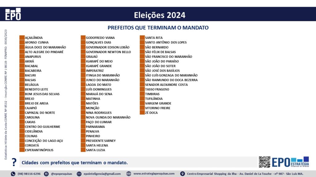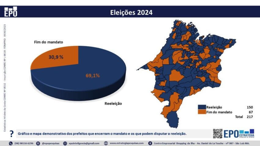 Um levantamento do Instituto Estratégia Pesquisas de Opinião (EPO) mostra que, em 2024, 150 prefeitos poderão tentar renovar seus mandatos no Maranhão.