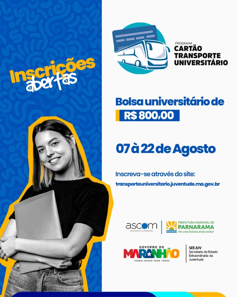 O Governo do Estado do Maranhão, por intermédio da Secretaria de Estado Extraordinária da Juventude (SEEJUV), abriu inscrições para participação no PROGRAMA CARTÃO TRANSPORTE UNIVERSITÁRIO – 2023.2, dirigido aos estudantes da rede pública e privada de ensino superior dos municípios maranhenses.