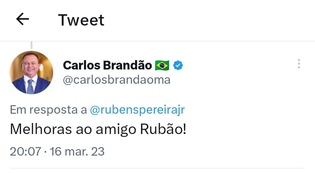 O Governador, Carlos Brandão, também comentou o Twitter de Rubens Jr: