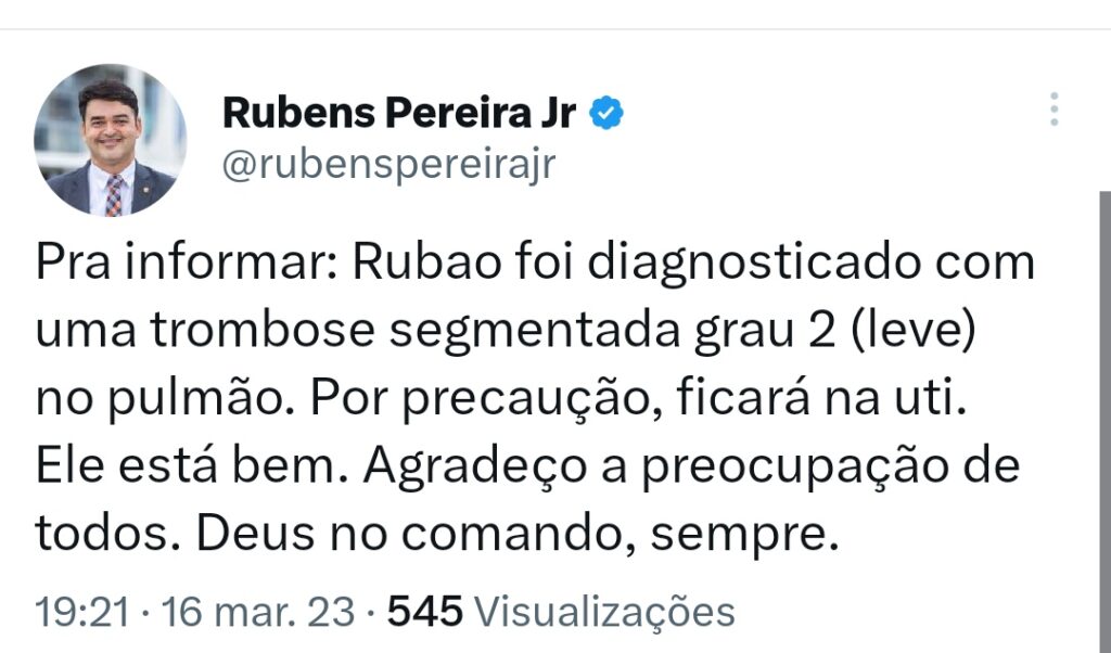 Rubens deu entrada no Hospital DMI por volta de 19:30 da noite da terça-feira com fortes dores nas costas e mal estar. O secretário passou por exames e identificou uma Trombose segmentada grau 2. Os médicos encaminharam Rubens para a UTI nesta tarde (16).