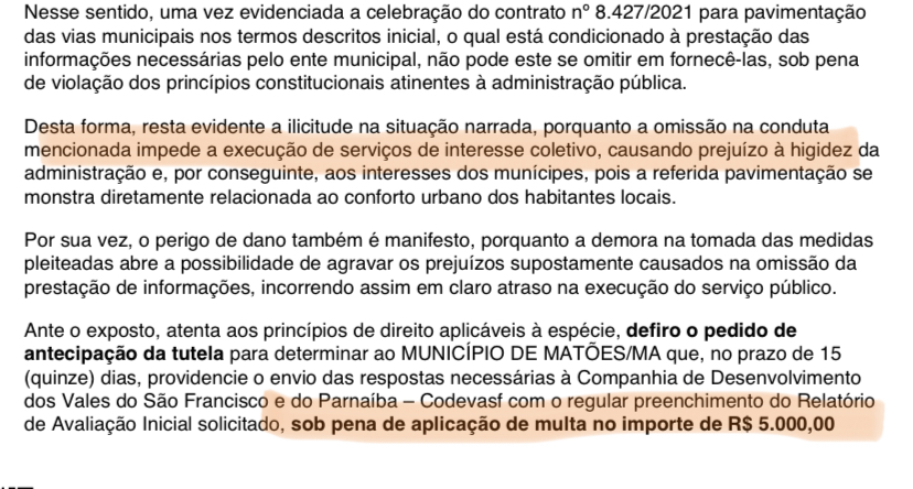 Decisão assinada nesta sexta-feira (15) pela juíza titular Sheila Silva Cunha estabelece prazo e multa caso a Prefeitura de Matões continue sem responder ofícios enviados pela empresa CODEVASF para execução de obra de asfaltamento na zona rural do município.