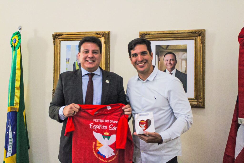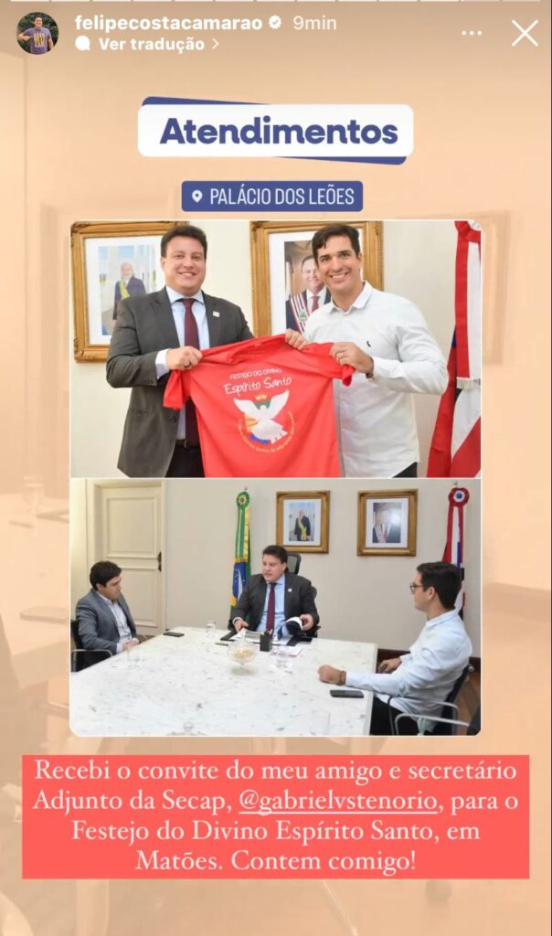 Em agenda com o governador em exercício nesta tarde (17), o secretário adjunto de Articulação Política, Gabriel Tenório, aproveitou para convidar Felipe para participar do tradicional Festejo do Divino Espírito Santo, em Matões. O festejo promovido pela igreja católica é considerado um dos maiores da região leste maranhense. Gabriel também presenteou Felipe com uma camisa festiva da paróquia de Matões.