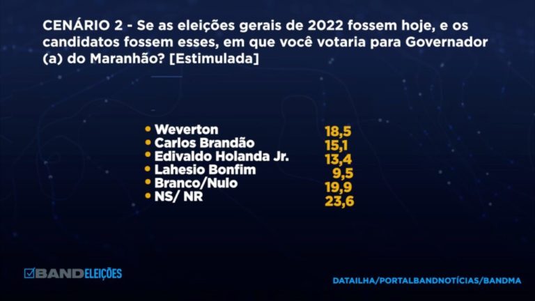 De acordo com os números, em um dos cenários, o senador Weverton Rocha (PDT) e o vice-governador Carlos Brandão (PSDB), principais pré-candidatos da base governista, estão tecnicamente empatados, o primeiro com 18,5%, o segundo com 15,1%.