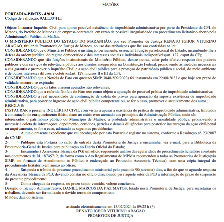A Promotoria de Justiça de Matões instaurou Inquérito Civil para apurar possível improbidade administrativa praticada pelo prefeito de Matões, Ferdinando Coutinho, e pela presidente da Comissão Permanente de Licitação (CPL), Maria do Perpétuo Socorro.