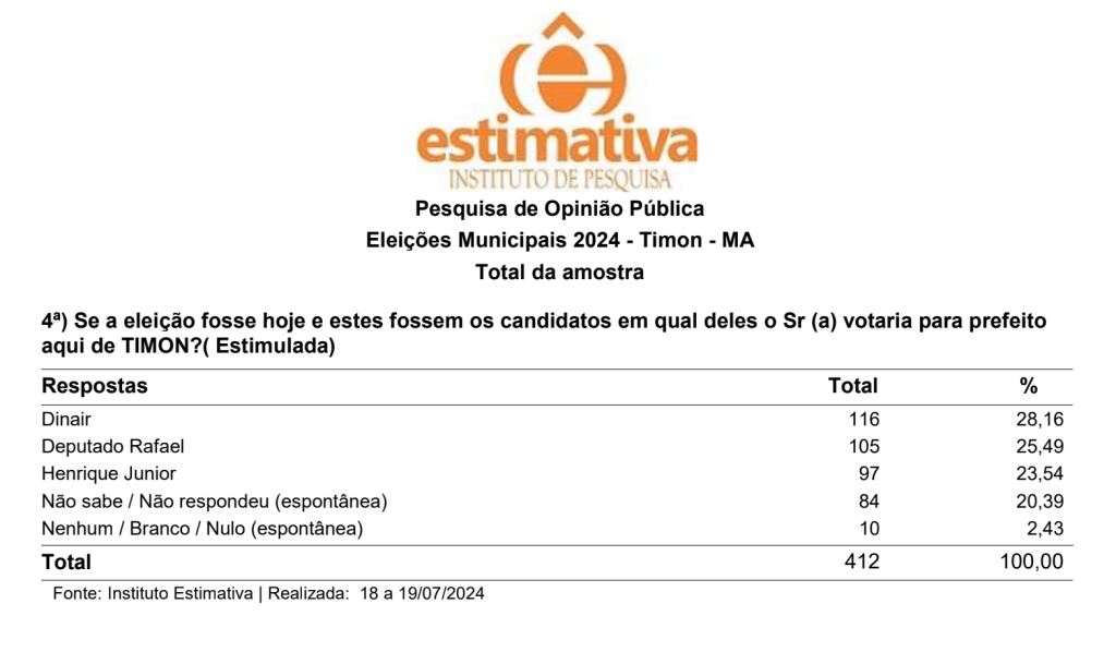 Uma pesquisa de opinião pública registrada pelo Instituto Estimativa, de Teresina, ouviu 412 timonenses entre os dias 18 e 19 de julho. A pesquisa revela a liderança da prefeita Dinair Veloso (PDT) na corrida eleitoral para renovar o mandato em Timon.