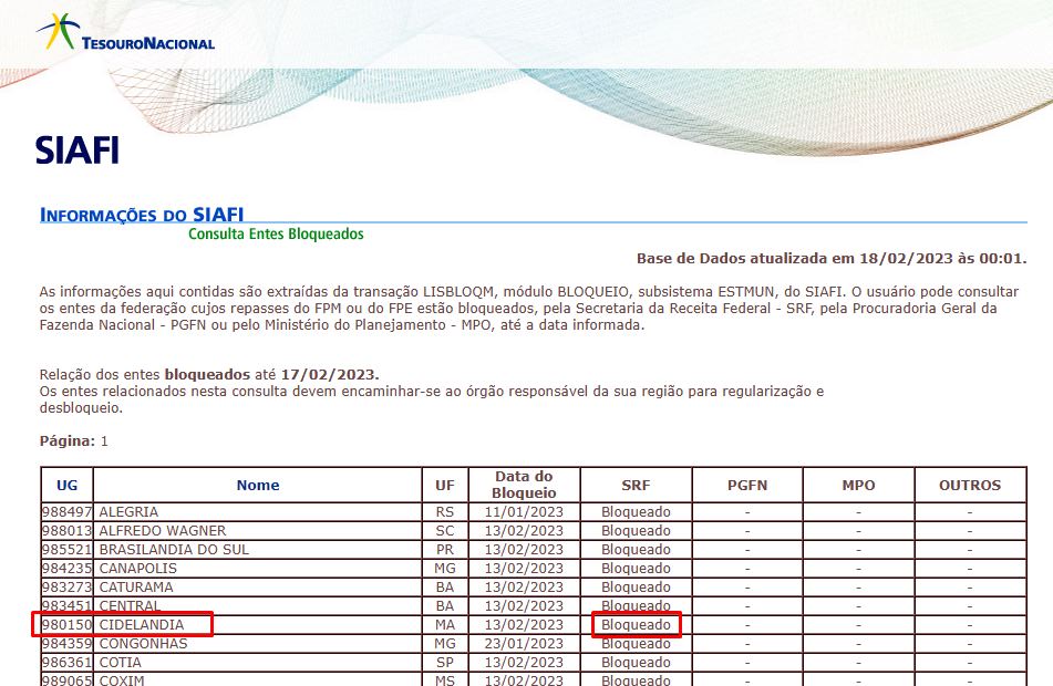 O município de Cidelândia, no Estado do Maranhão, distante 640 km da Capital São Luís, teve o seu FPM (Fundo de Participação dos Municípios), principal fonte de receita, BLOQUEADO, segundo o SIAFI.