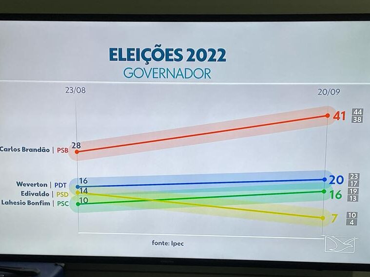 Em seguida, aparecem Weverton Rocha (PDT), com 20%, Lahésio Bonfim (PSB), com 16%. Edivaldo Holanda (PSD) está com 7% das intenções de voto.