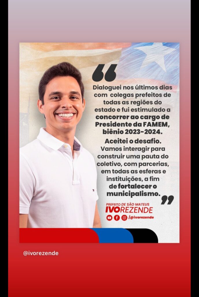O jovem prefeito de São Mateus, Ivo Rezende, será o candidato a presidência da Federação de Prefeitos do Maranhão (FAMEM) apoiado pelo governador Carlos Brandão (PSB).