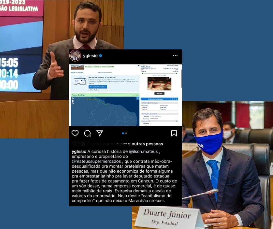 O deputado estadual Yglésio Moisés ( PROS) fez uma denúncia bombástica em sua rede social Instagram, afirmando que Duarte Junior usou um jatinho do empresário bilionário Ilson Mateus, para viajar até Cancún no litoral do México, para oficializar sua união com a esposa Karen Barros.