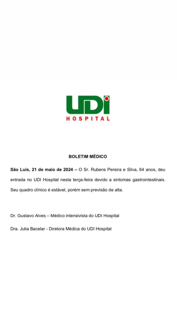Nesta manhã (22) o hospital UDI, na capital São Luís, emitiu nota sobre o estado de saúde do secretário de estado de articulação politica Rubens Pereira. Estável diz a nota, mas sem previsão de alta médica. Confira: