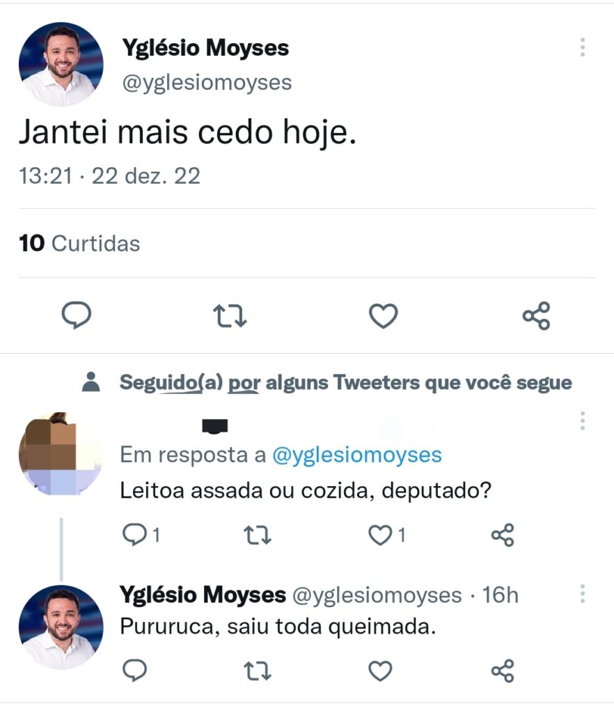 Mais tarde, em sua rede social Twitter, Yglésio ainda comemorou como vencedor do embate. Disse que jantou Leitoa à Pururuca: