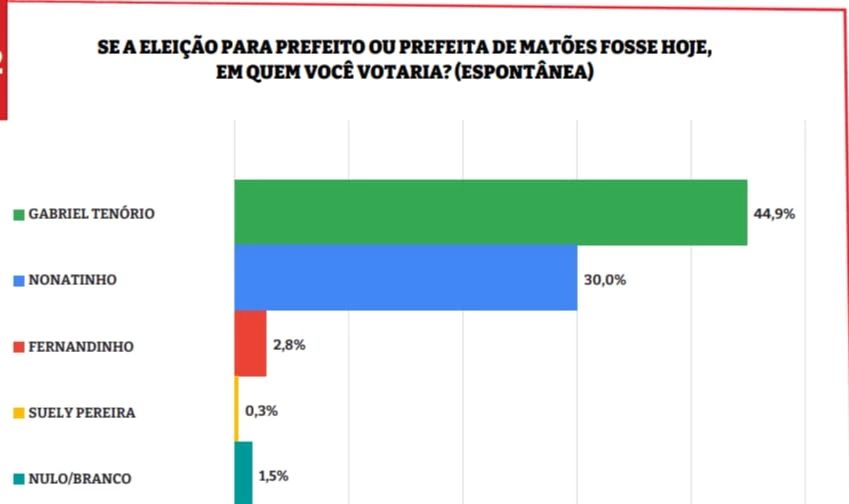 O primeiro cenário apresentado no levantamento é o espontâneo. Nele, Gabriel Tenório aparece com 44,9% dos votos seguido por Nonatinho Medeiros (União Brasil) com 30%. Fernando Coutinho, atual prefeito, obteve 2,8% e Suely Pereira, 0,3%.