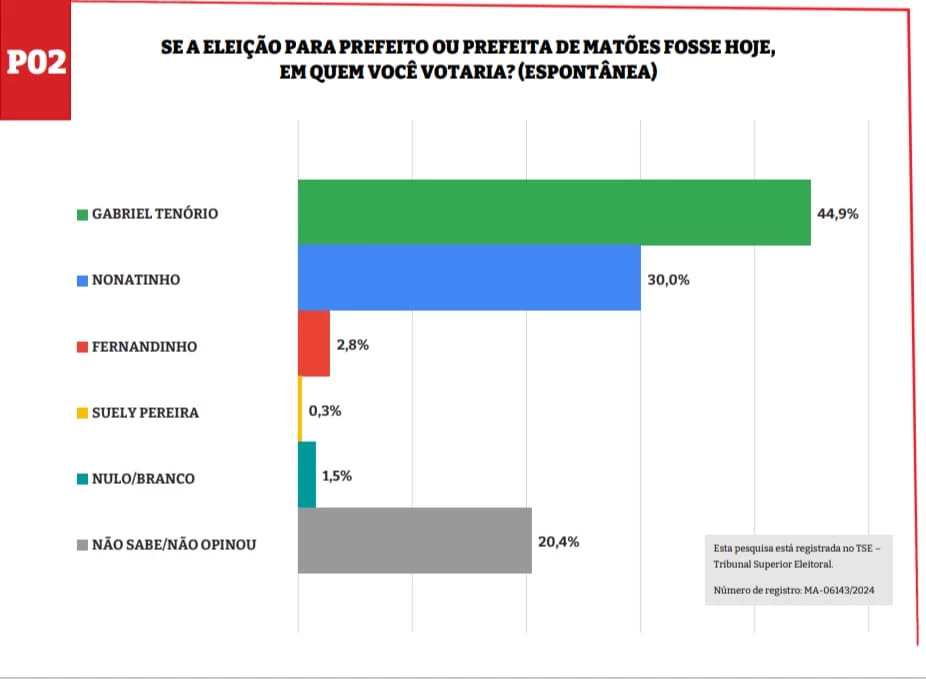 A pesquisa realizada em Matões entre os dias 19 e 20 de Julho aponta a liderança de Gabriel Tenório na preferência dos matoenses para as eleições desse ano. Confira os cenários apresentados aos 600 entrevistados.