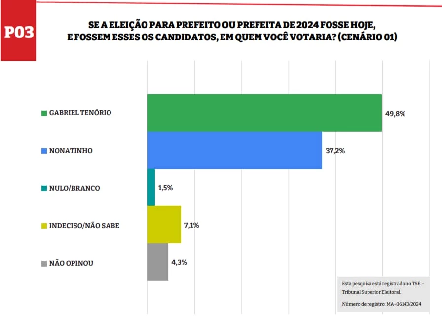 Já no cenário estimulado, a vantagem de Tenório aumenta. Ele alcança 49,8% dos votos e Nonatinho chega a 37,2%. Votos brancos e nulos somam 1,5%, indecisos ou não sabem, 7,1% e não opinou 4,3%.