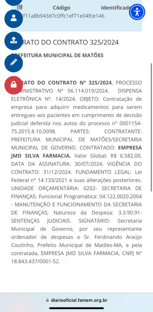 Restou ao secretário municipal de saúde de Matões, Elliel Rossano, somente cumprir a sentença, ja que não teve escolha, tendo em vista também que o município de Matões não se manifestou no prazo legal quando convocado pela juíza. O documento abaixo conseguido no Diário Oficial do município ressalta a razão da compra por decisão judicial, citando o número do processo N 0001154-75.2015.8.10.0098.