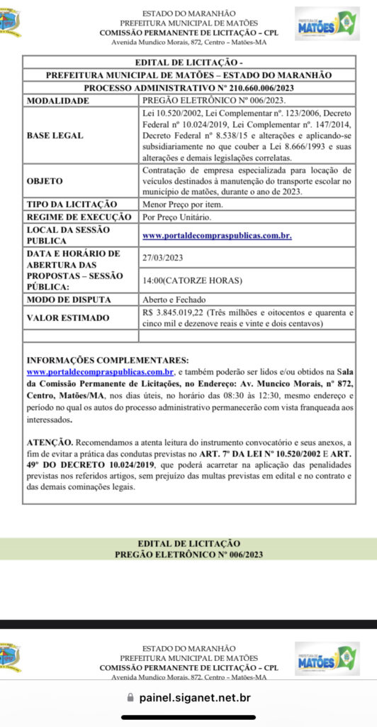 Em 24 de Março de 2023 o secretário e hoje candidato a prefeito de Matões, Raimundo Nonato Medeiros, então secretário de Governo da Prefeitura de Matões, autorizou uma licitação que previa o gasto de quase R$ 4 milhões de reais para o transporte escolar (exatos três milhões oitocentos e quarenta e cinco mil dezenove reais e vinte e dois centavos) como consta abaixo: