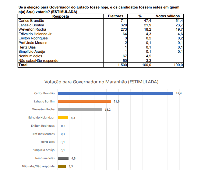 Em relação aos votos válidos, a pesquisa aponta possível vitória no primeiro turno com Carlos Brandão com 51,4 %; o ex-prefeito de São Pedro dos Crentes, Lahesio Bonfim em segunda posição com 23,7%; o senador Weverton Rocha em terceira colocação com 19,7; o ex-prefeito de São Luís, Edivaldo Holanda Junior 4,6%; o psolista Enilton Rodrigues com 0,2% e empatados com com 0,1% Joas Moraes, Hertz Dias e Simplicio Araújo.