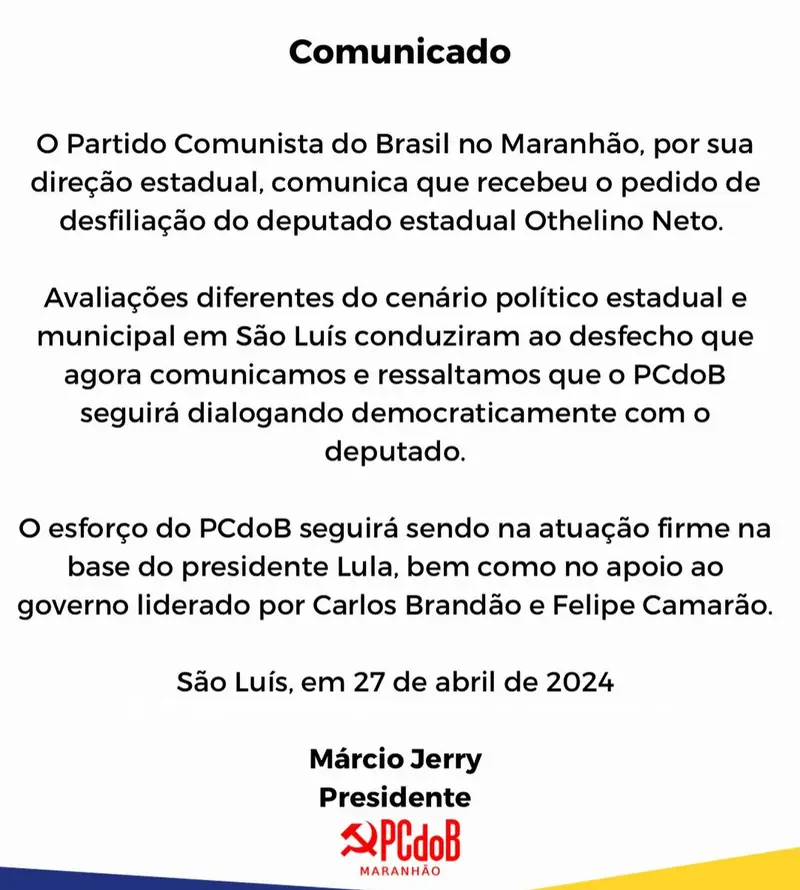 O deputado e presidente do PCdoB Maranhão comunicou a saída do deputado Othelino Neto do partido, segundo o que foi publicado por Marcio – Sem Problemas, já que este ano não tem janela partidária para deputados.