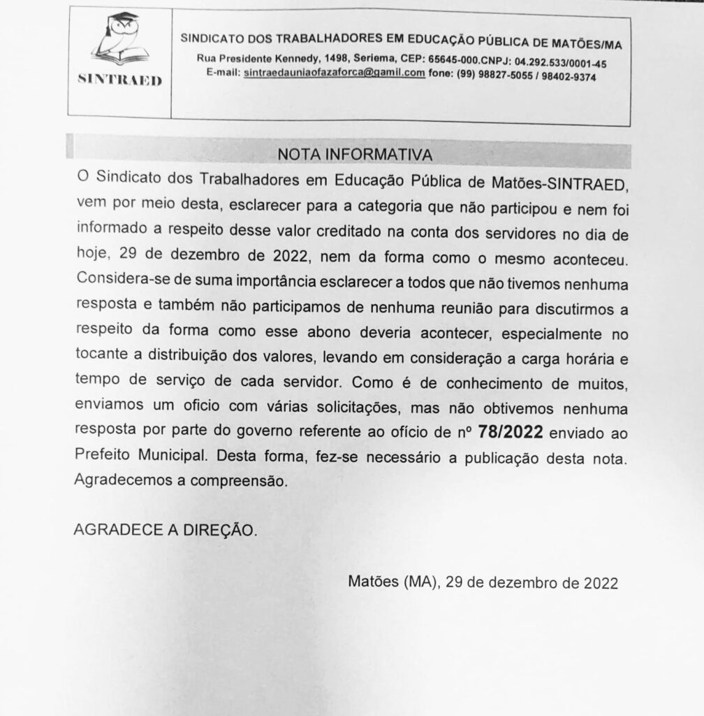 Em Matões, o Sindicato dos Trabalhadores em Educação Pública em Matões (SINTRAED), emitiu nota contra o Prefeito de Matões, Ferdinando Coutinho, sobre o pagamento do abono salarial de fim de ano.